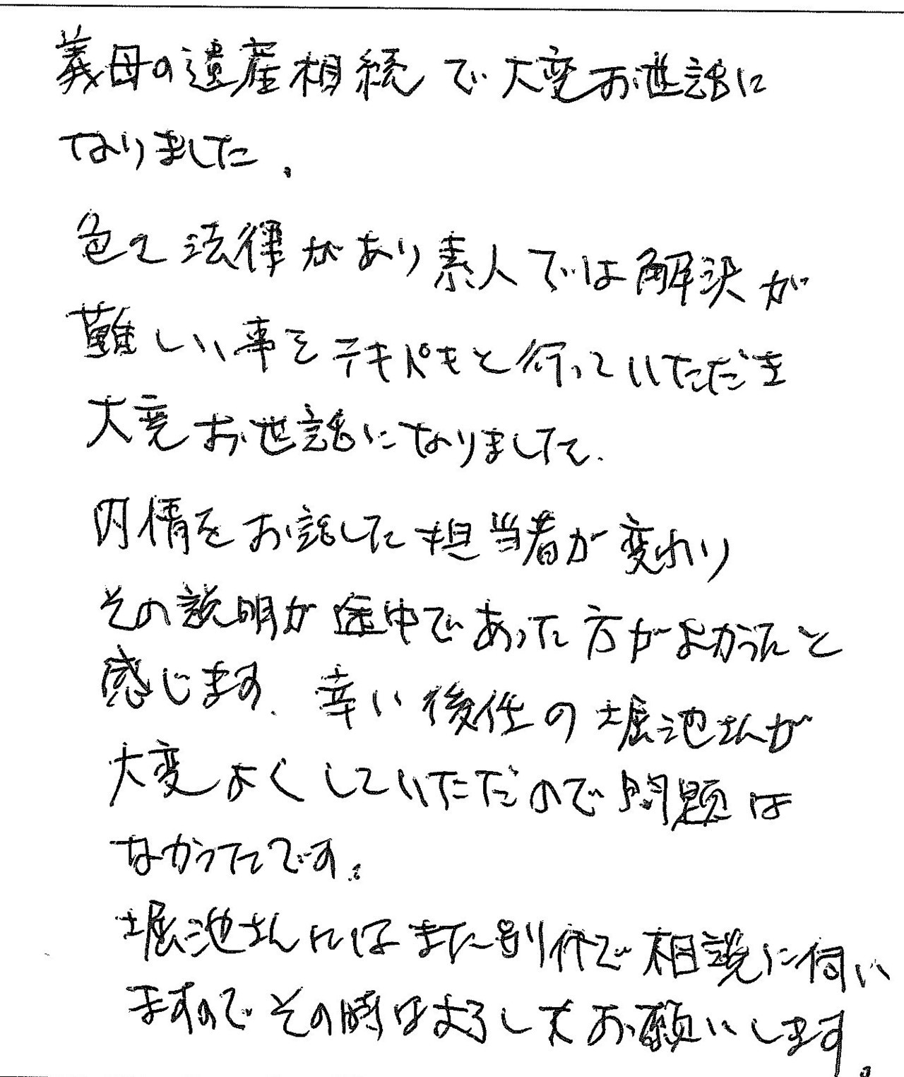 義母の遺産相続で大変お世話になりました。色々と法律があり素人では解決が難しい事をテキパキと行っていただき大変お世話になりました。