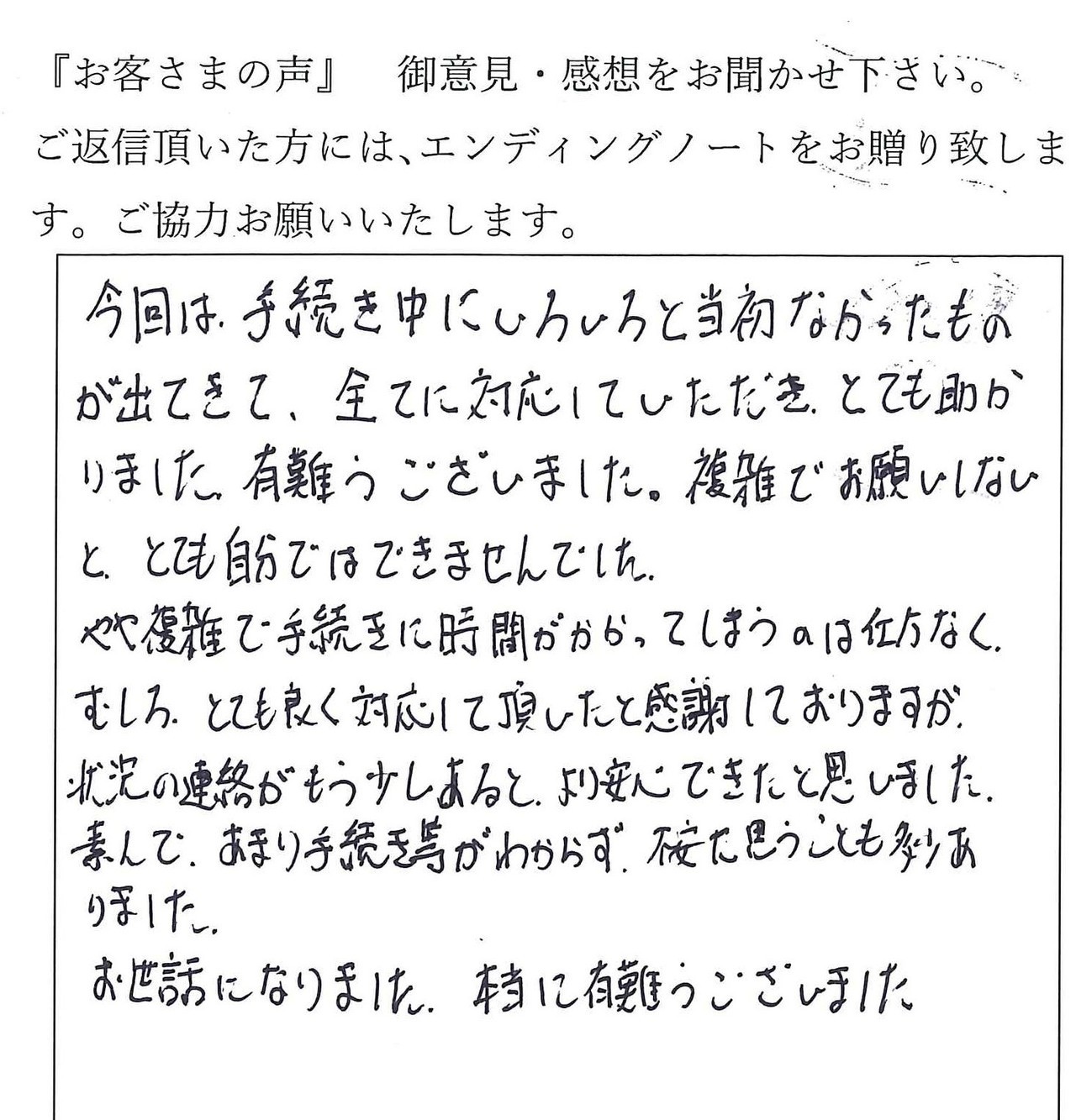 今回は手続き中にいろいろと当初なかったものが出てきて、全てに対応していただき、とても助かりました。有難うございました。複雑でお願いしないと、とても自分ではできませんでした。