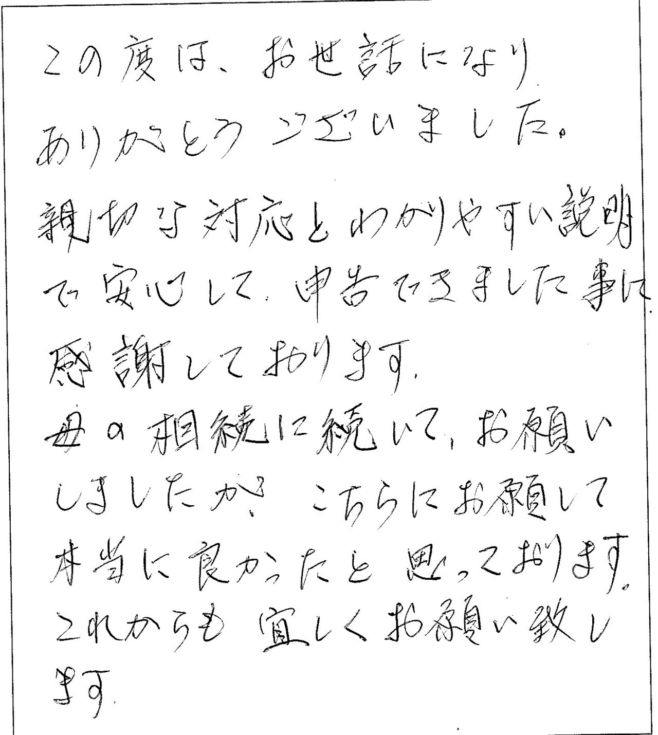親切な対応とわかりやすい説明で安心して、申告できました事に感謝しております。