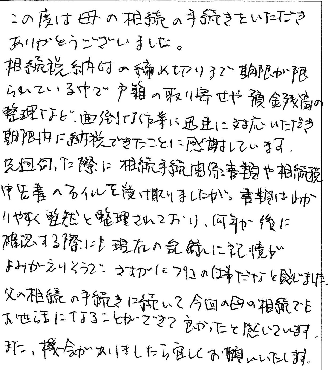この度は母の相続の手続きをいただきありがとうございました。